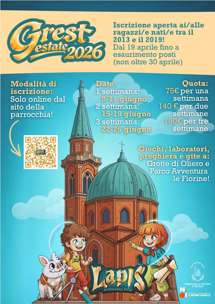 Le iscrizioni avranno inizio Domenica 19 Aprile dopo la S. Messa delle 10.00 e termineranno il 30 Aprile o fino ad esaurimento dei posti.