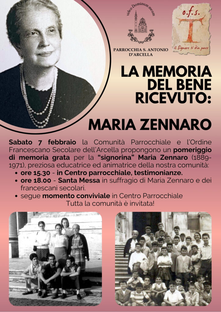 La Fraternità dell’Ordine Francescano Secolare di Sant’Antonio d’Arcella, insieme alla Comunità Parrocchiale ha pensato di organizzare per il pomeriggio di sabato 7 febbraio p.v. un momento celebrativo dedicato al ricordo di Maria Zennaro.